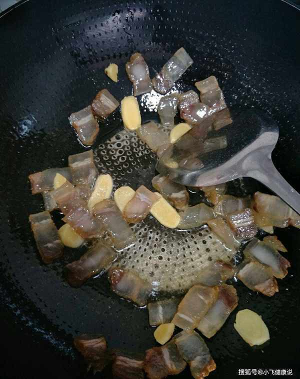 第四步:烧热少许冷油,放入几片腊肉翻炒,等腊肉油炸出,很香,将腊肉煎至透明,稍炸均匀。