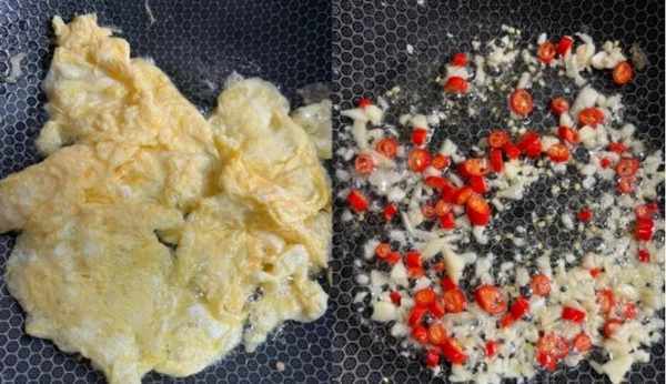 第七步:倒入煮好的鸡蛋,加入半勺盐和半勺糖,加入鸡汤等调料,将食材炒匀。