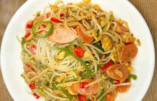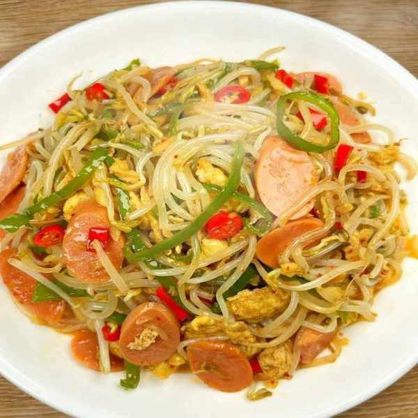 第八步:把它放在盘子里,然后从锅里拿出来。这道菜由豆芽炒鸡蛋、火腿和完整的香肠组成。