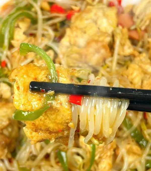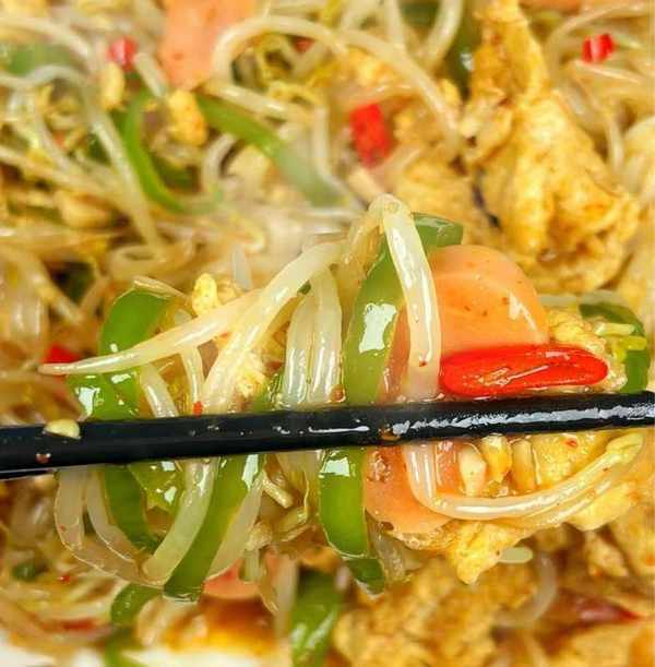第六步:倒入一些豆芽和切好的青椒,炒至生,加入酱油和蚝油,加入辣椒和花椒,快速翻炒。