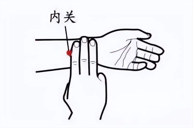 【位置】内关穴位于前臂掌侧,腕横纹向上3指的位置,掌长肌腱与桡侧腕屈肌腱之间。