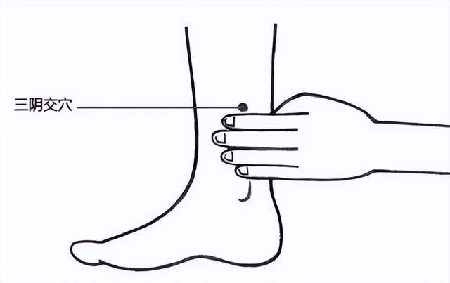 【位置】三阴交穴位于小腿内侧,足内踝尖上3寸,也就是4横指处,胫骨内侧缘后方,为脾经、肾经、肝经交会之处。
