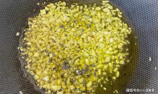 第四步:锅底加入少许花生油,待油温达到60%时,加入姜末和蒜末,用小火快速翻炒出香味。