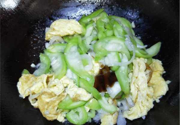 第六步:锅底加入鸡蛋块,海绵和鸡蛋炒至入味,加入适量蚝油、半勺生抽快速翻炒几下。