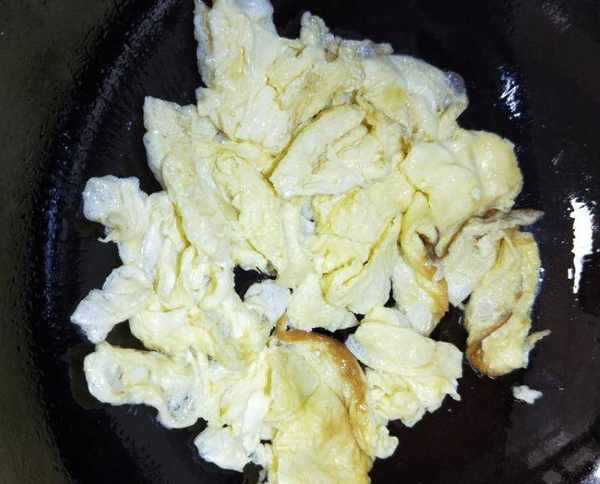 第四步:取一锅,锅底烧热,加入蛋液煎至熟,用筷子翻动几下,使鸡蛋成型,防止粘锅。切成小块,盛入碗中。