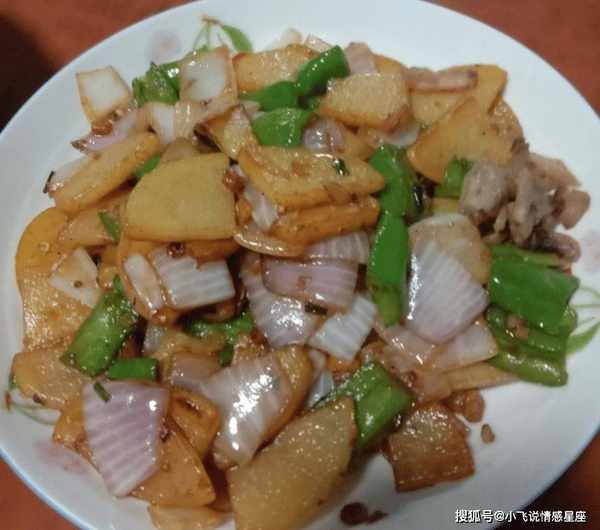 5:最后装盘,也可以加入葱花。这是一道油炸土豆菜,配以青椒和大量洋葱。比酸辣棒还好吃。你也可以试试。