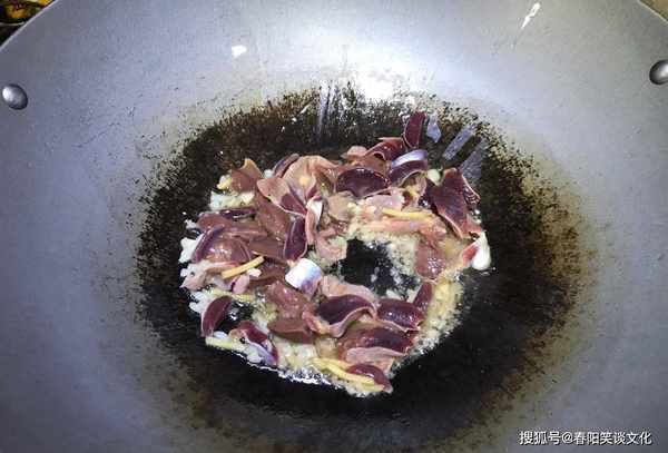 第六步:锅底冷油烧热,加入蒜末翻炒出香味,加入腌好的鸡内脏炒至变色,让鸡内脏炒至变色。