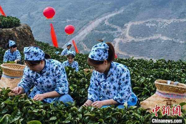诵读《茶经》、鸣锣开茶、醒狮采青等传统仪式在开茶节上展示;远处的茶山上,采茶女点缀在垄垄的茶田中,将一片片新鲜的茶叶装入茶篓,构成一幅幅喜气洋洋的茶乡春景。