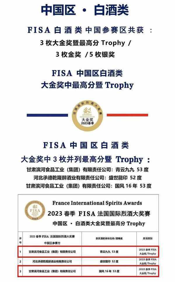 又是一年春来早,桃花盛开喜报来!3月20日,2023年FISA法国国际烈酒大奖赛中国区的春季评奖结果出炉! 甘肃滨河食品工业(集团)有限责任公司旗下产品:青云九九、国风16年斩获白酒类大金奖暨最高分Trophy;两项大金奖提振士气,振奋人心,进一步奠定了滨河集团旗下品牌的国际地位。