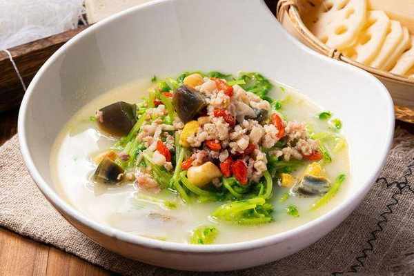 瘦肉切成细丝,大蒜切成丁,火腿和皮蛋全部切小块,豆苗洗净待用。锅中倒入油,再加入大蒜和瘦肉,煸炒一会儿,再加入一大盆清水烧开,然后倒入火腿和皮蛋继续煲两分钟,再加入豌豆苗再煲三分钟,加盐和鸡精调味即可出锅。
