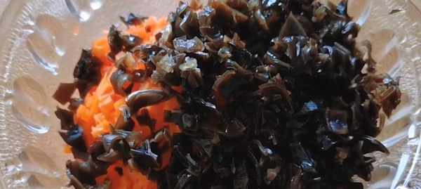 准备半根去皮的胡萝卜,切成小方块,香菇泡软,切成细条,剁成小方块,用胡萝卜块包起来。