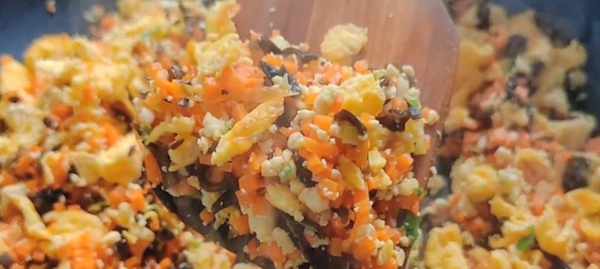 将它与鸡蛋混合,然后加入切丁的胡萝卜和切碎的蘑菇并继续搅拌,直到所有成分都破碎并释放出香气,就是这样。稍微放凉,放入榆钱中。