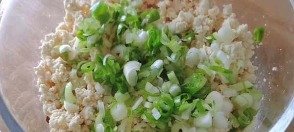 准备一小块豆腐,全部压碎在碗里待用。准备一根小葱,切成细碎的葱。葱花可以稍微煮熟。