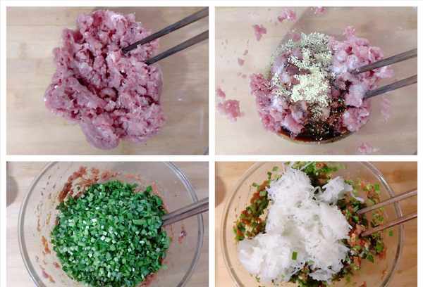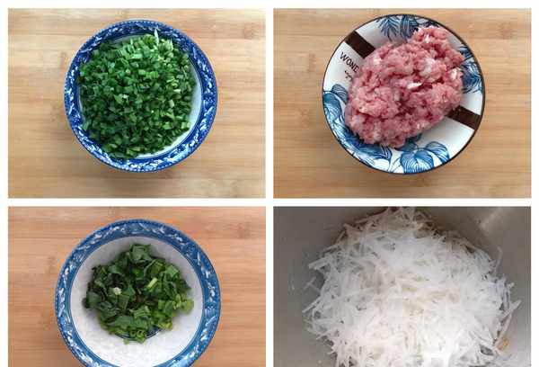 韭菜一把,猪肉250克,白萝卜半个,生抽、香油、食用盐、鸡精、五香粉等。