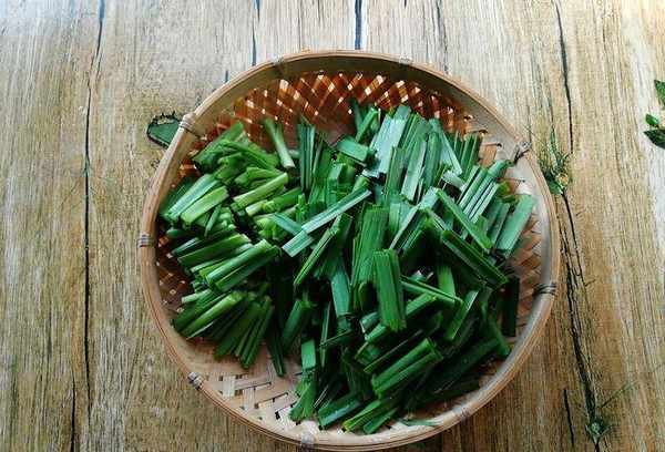 第三步:将韭菜剪去弱根,剪去黄叶,经常用清水将韭菜洗净,切成小块备用。
