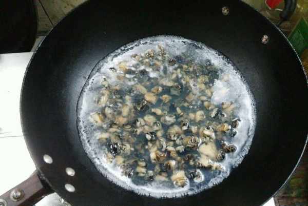 第六步:起锅烧热,加入更多的食用油,放入田螺肉快炒,加入少许白醋和料酒,料酒挥发即可去除田螺的腥味。.