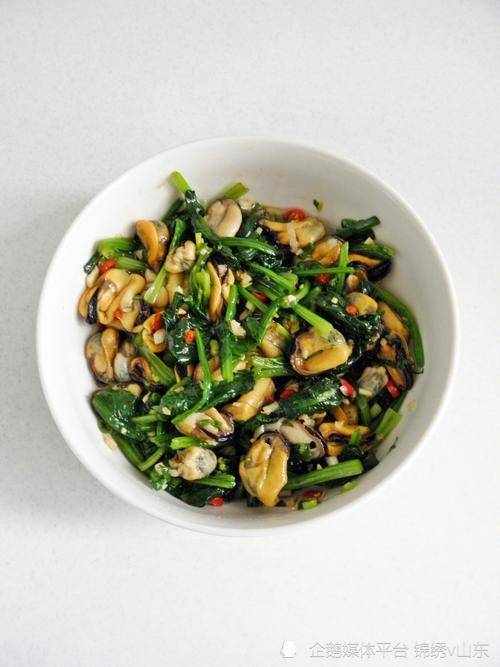 3. 将菠菜清洗干净,焯水后切段,跟海虹放在大碗里