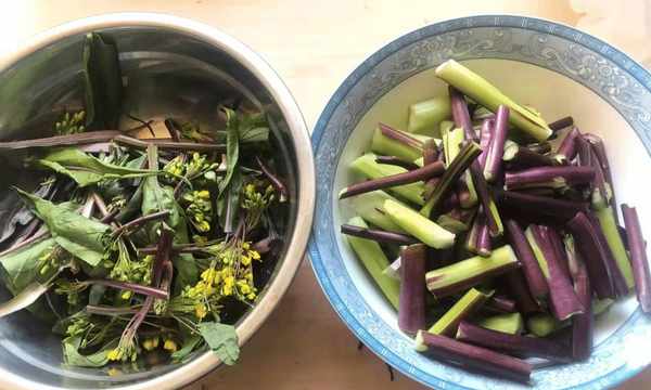 1:放一些紫菜苔和小菜,捏住紫菜苔的花茎,从紫菜苔的根部剪去尾巴(一般过段时间会氧化,记得剪掉不新鲜的)