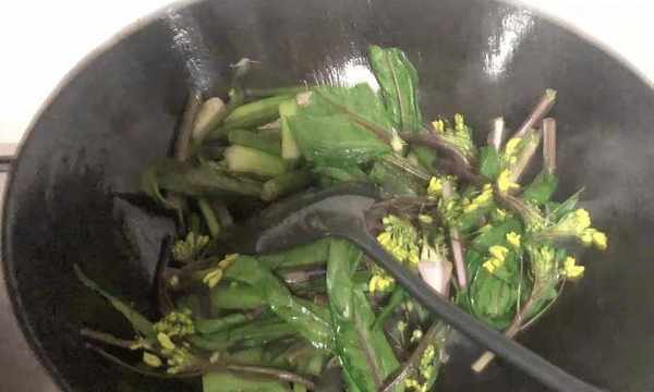 5:放入紫菜苔根茎翻炒,小火炒至断生,最后放入嫩尖和嫩叶,锅边倒入半勺水,快速翻炒30秒。