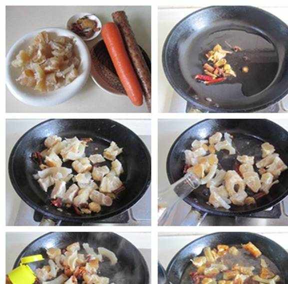 制作:1.准备好原材料;2.热锅凉油,放入大料和姜片煸炒;3.煸炒出香味后加入蹄筋进去翻炒;4.翻炒几下后烹入适量的料酒;5.再加入酱油翻炒上色;6.加入适量的水;