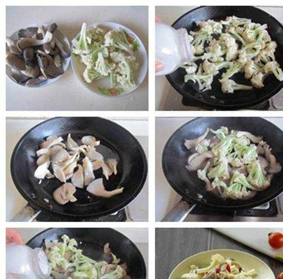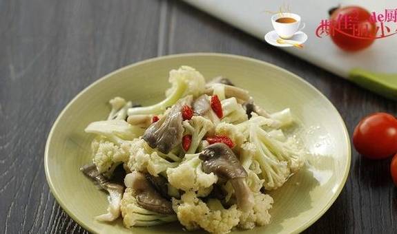制作:1.准备好原材料;2.烧锅开水,加入点盐,将花菜放入里面焯煮到七、八成熟;3.热锅凉油,放入平菇进去翻炒;4.微微炒软后加入花菜进去继续翻炒;5.翻炒几下后加入盐调味,翻炒均匀;6.盛入盘中,表面上点缀上红椒。