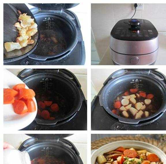 7.将它们倒入高压锅中;8.按下高压锅炖煮牛筋的功能键,大约30分钟后,牛筋炖好了;9.加入胡萝卜继续炖煮五分钟;10.再加入山药,煮上三分钟后大火收汁;11.加入盐和胡椒粉调味;12.盛入盘中,表面撒上小葱末。