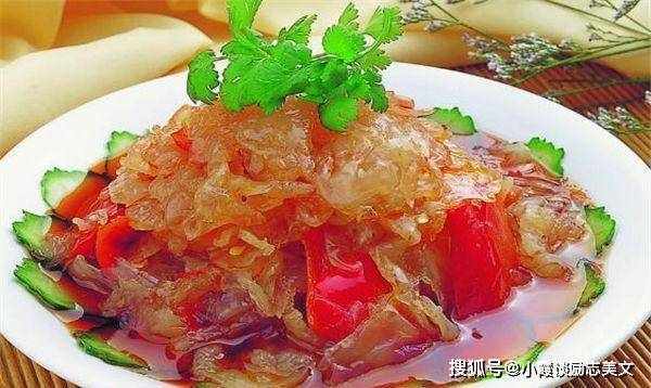 步骤:1、海蜇、虾分别洗净,切成纤维状。将切碎的海蜇皮放入开水锅中焯一下,捞出放入清水中冷却,再用清水浸泡片刻;