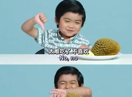尝试吃一点榴莲之后,外国小男孩一边摇头一边倒竖着大拇指,直言榴莲一点也不好吃,非常不喜欢榴莲的味道。
