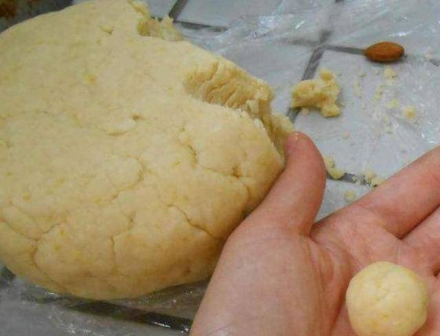 第五步:然后把所有的东西混合均匀成絮状,继续揉成面团,取一小块面团放在手心揉成一个小球,然后放在案板上用手压一下你。手指。