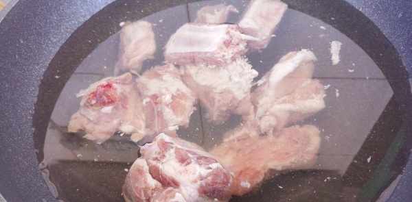 第三步:排骨再次用清水冲洗干净,继续转移到炖锅中,加入一些姜片,加入适量热水,两汤匙料酒,盖上锅盖大火炖30分钟。