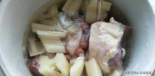 烹调步骤6:将鸭块煮开,撇去表面浮沫,放入花生和莲藕,盖上锅盖继续大火煮60分钟左右。
