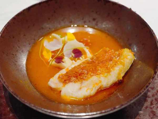选自福建海域的石狗公,做了类似日料里立鳞的处理,鱼肉细嫩鱼鳞脆,酸汤里配了番茄芯、白木耳、芦笋虾胶卷花生芽,细致极了。