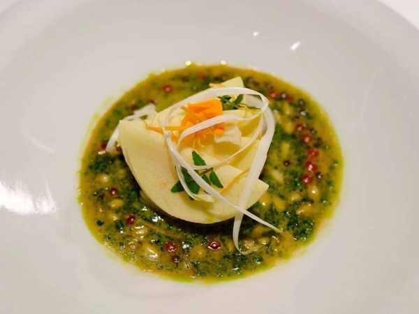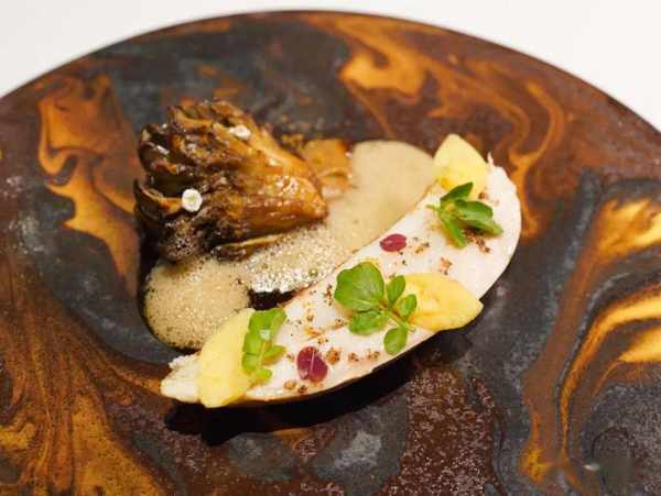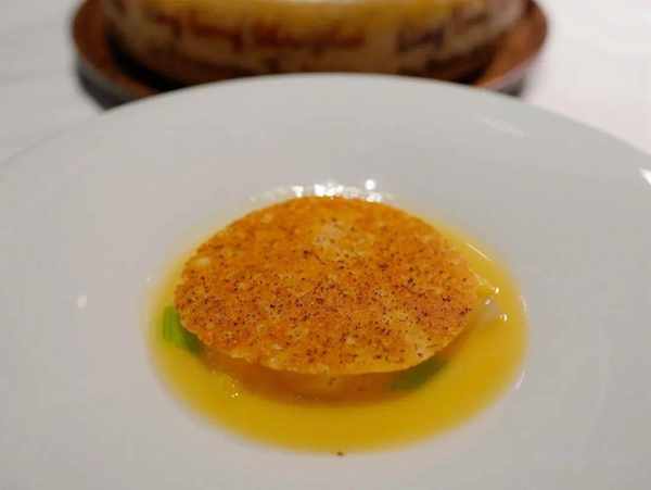 跟着一道食材是花胶,做法完全打通关隘,泡发得当的花胶伴意式土豆团gnocchi,口感皆软糯,特意找了中国制的帕玛森芝士烩入鸡汤,令西式的鲜浓奶味与中式的浓醇鲜味融会贯通,叫人一时恍惚,我吃的是中餐还是西餐?