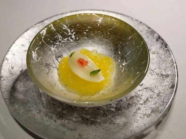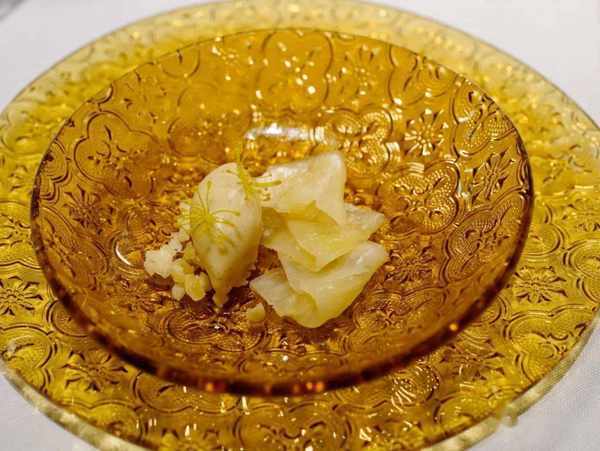 下一段落的菜式,意在突出中国食材,我们迎来了云南西双版纳的棕榈芯,点缀几丝瑶柱,底下配了扇贝,盘中散落的鱼子酱、三文鱼卵和指橙带来鲜酸缤纷的爆珠口感,还有一层松仁和细葱增香,这儿的 酱汁很特别,似乎借用了日式的昆布出汁……只是如此煞费苦心的美味配菜,反倒令主角棕榈芯显得可有可无。