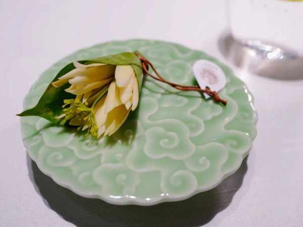 上主菜之前照例是清口环节,这里没有用老套的雪芭,玩法令人耳目一新!先是送来一株白兰花,花香扑鼻,嗅觉刷新。