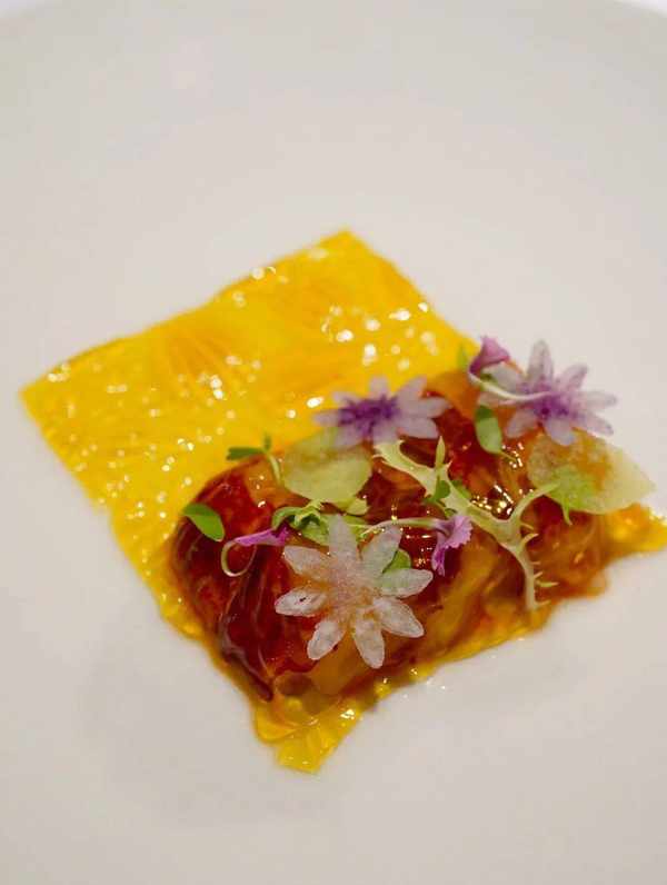 一道蓝龙虾,搭配的酱自命为“海山酱”,用虾米、番茄和桔油做成,鲜味取自山海之间,又用黄酒和虾露做了一层啫喱,令层次更加丰富,我似乎隐约还闻到了金不换的气息……