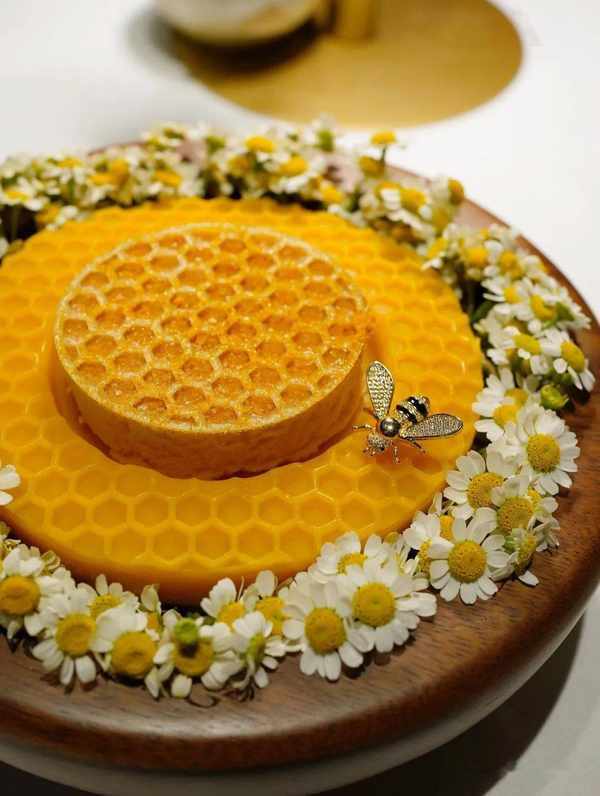 大甜品蕴含了三种蜂蜜,带着自然不过分的甜,逼真的蜂巢、蜂蜡和蜂花,还有一只珠宝般精致的小蜜蜂,让我想到了年轻时戴过的Chaumet……