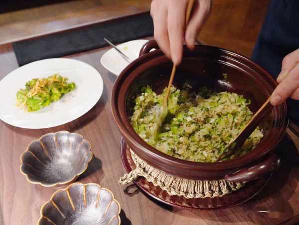 席间我们笑谈,没有用到咸肉和猪油渣,不能算是正宗的上海炒饭,可谁会忍心责怪主厨呢,台湾小伙子帮米饭配的蔬菜是他老家来的山苏,新鲜滑嫩的蕨类,是宝岛的珍味啊。