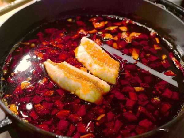 当天的鱼菜大胆结合了水煮鱼和酸菜鱼的做法,桌边服务将鱼从红油撩进酸汤,隔着桌子都能闻到老辣油的香。