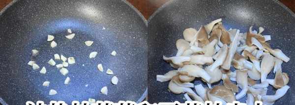 第七步:锅底加入食用油和蒜片,倒入适量平菇丝炒软,加入西葫芦炒至生。