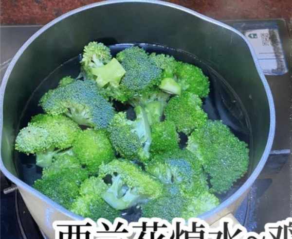 第二步:西兰花用剪刀剪成小朵,用清水冲洗干净后放入锅中,加少许盐,焯几分钟捞出。