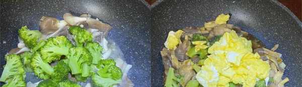 第八步:倒入炒蛋,快速翻炒片刻,加少许盐、生抽和少许蚝油,中火翻炒几下,关火,这道西兰花炒蛋就做好了蘑菇准备好了。