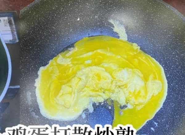 第六步:取锅预热锅底,将蛋液倒入锅中,蛋液慢慢煮熟,鸡蛋成块后翻面煮熟,鸡蛋煮熟,出锅锅以备后用。