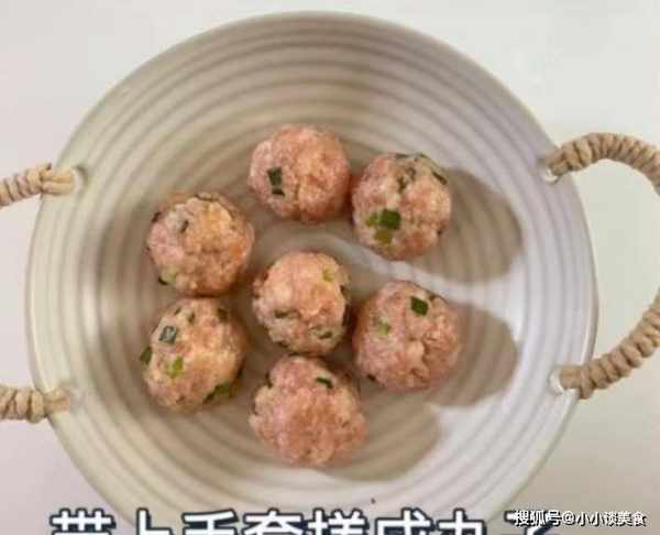 第四步:用手把莲藕和肉末放在一起,揉成圆形,装盘待用,烧开半锅水,加入莲藕和猪肉丸子,等猪肉丸子熟了煮熟,取出并放在一边。