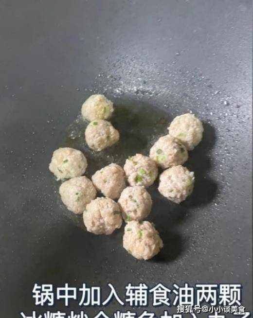第五步:提前准备一小碗酱料,加入一勺生抽、一勺淀粉、一勺番茄酱、盐等调料,搅拌均匀。第六步:锅底放少许橄榄油,加入冰糖两颗,炒至糖色,倒入莲藕肉丸,炸至金黄。
