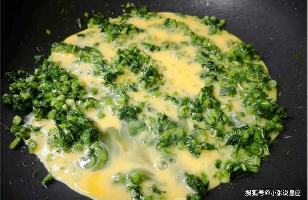 4:鸡蛋煎好,锅里倒少许食用油,将茴香倒入锅中,让茴香炒香,撒少许盐,白胡椒粉最后放胡椒粉。