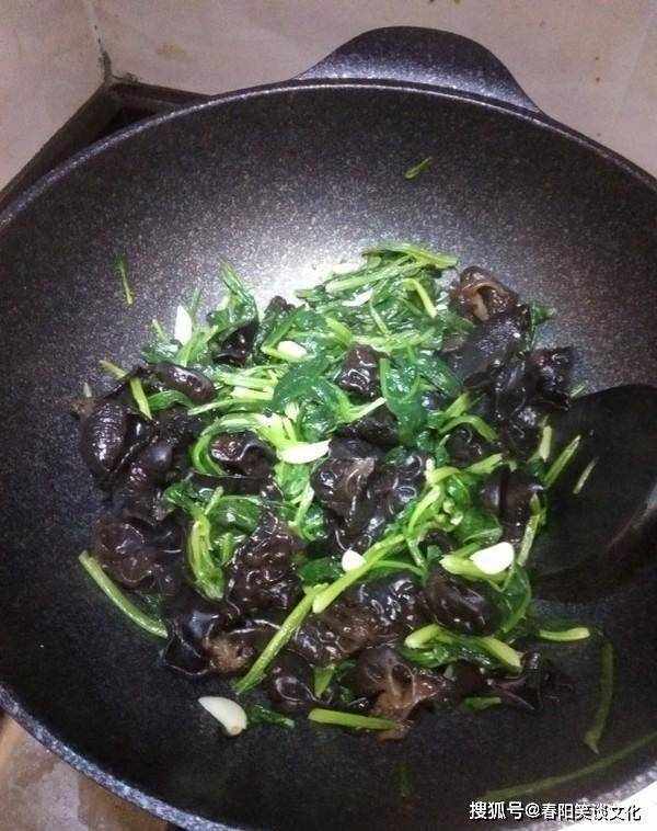 第五步:倒入黑蘑菇块翻炒几下。将半勺水倒在锅边,让黑木耳爆开。加入焯过的菠菜,煮至变软。