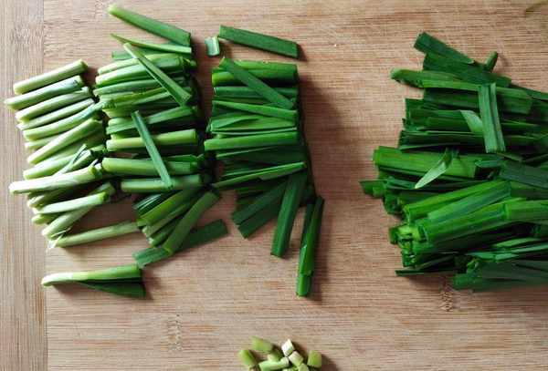第二步:将韭菜用盐水泡软,洗净切块,炸好的豆腐用清水冲洗干净,对半切开沥干水分待用。