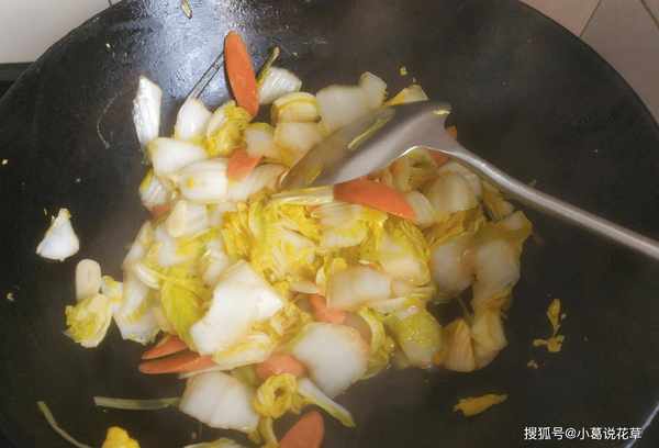 第五步:锅中加入适量姜末和葱花,放入小白菜炒至生,加入适量盐,搅拌均匀,加入一勺蚝油和一勺生抽,翻炒一会在中等热量下。
