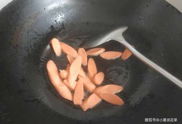 第四步:起锅,锅底加入食用油。锅底油60%热,加入切碎的火腿肠翻炒。将火腿香肠煎至棕色。